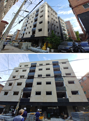 독산동 오피스텔 2동 시공현장입니다. 외장 전면 다 돌로 시공 하였습니다